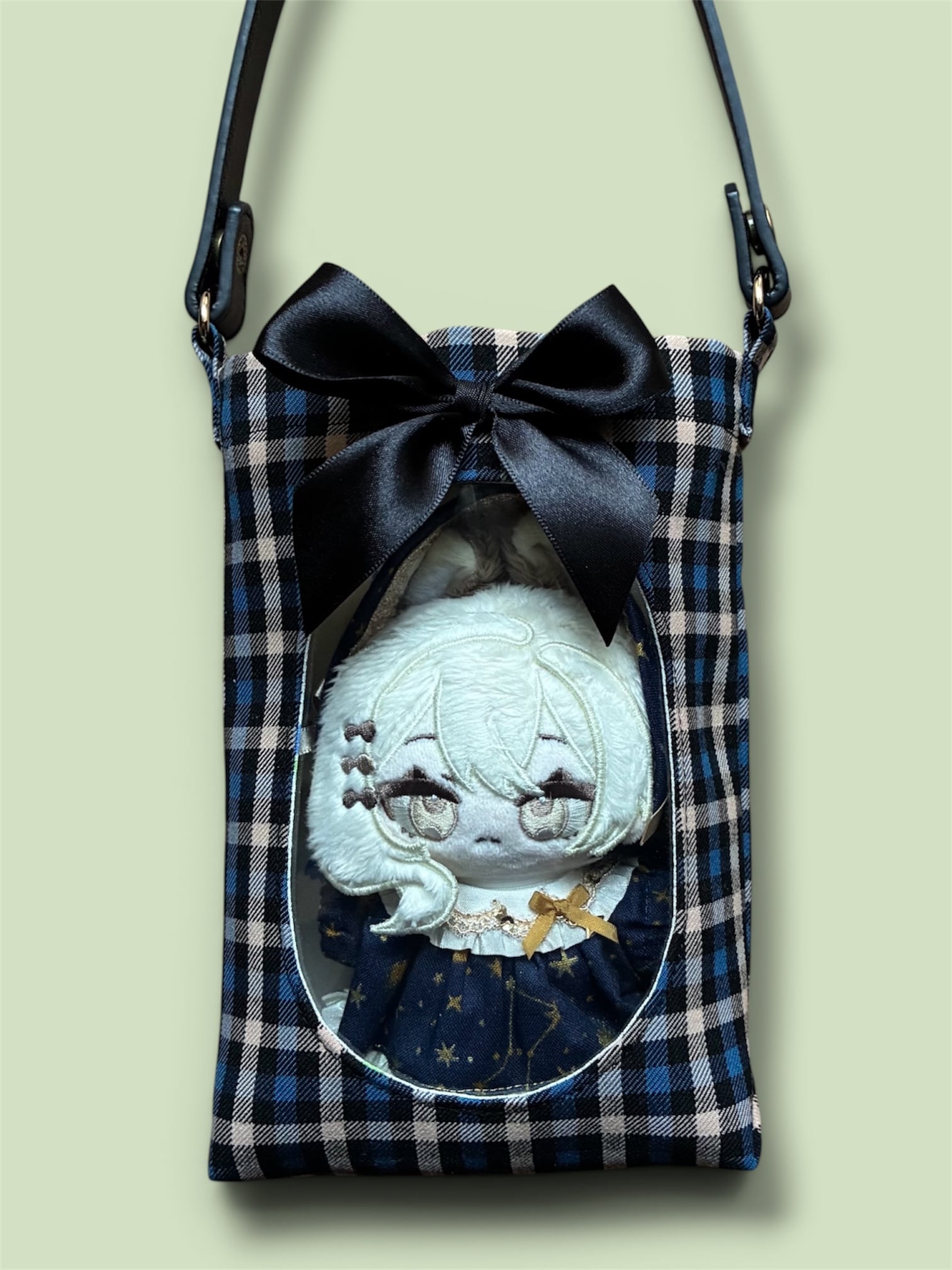 ブルー系の衣装を着たぬいちゃんや、クールな雰囲気のぬいちゃんにもぴったりな、爽やかで知的なデザインです。ブラックのリボンが全体をキリッと引き締めてくれます。