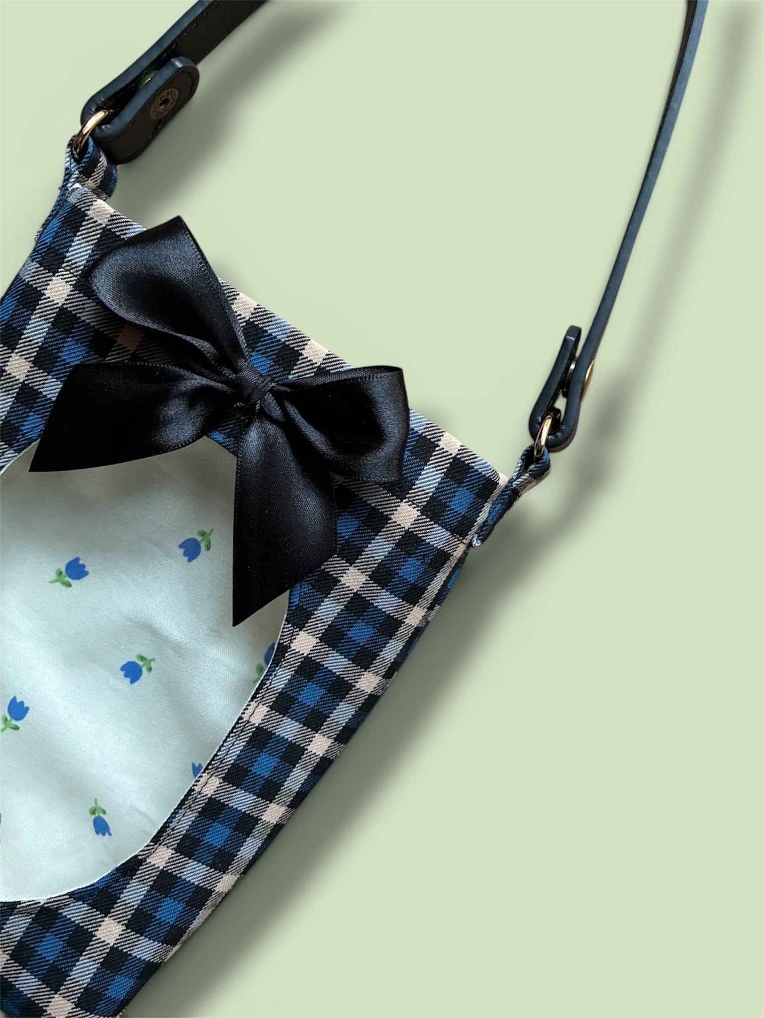 落ち着いたブルーとベージュのチェック地に、窓から覗く裏地のチューリップ柄がアクセント!