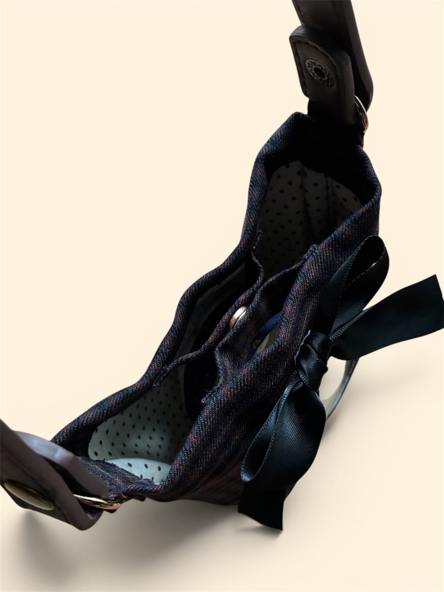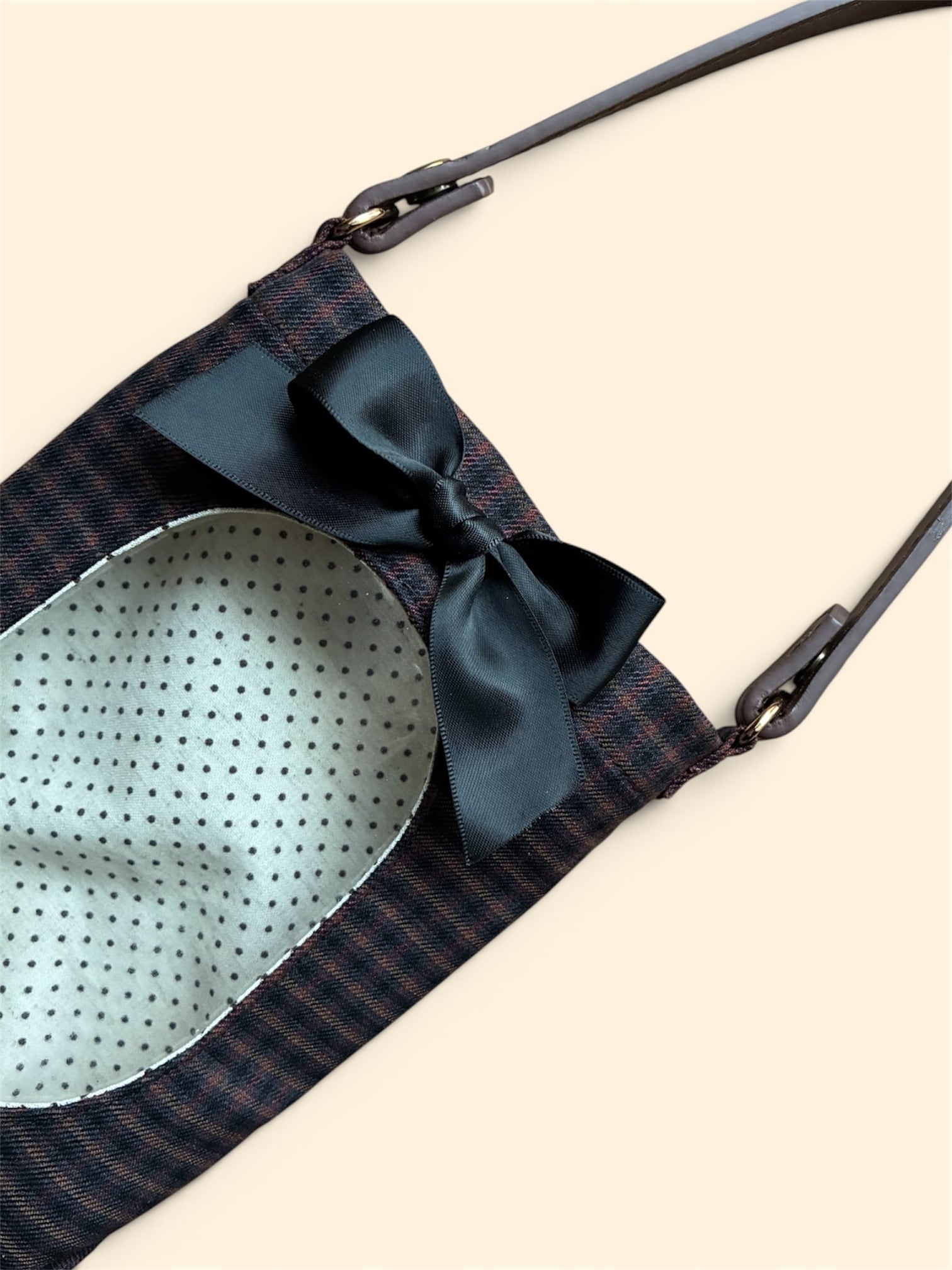 オフブラックベースの温かみのあるブラウン系のチェック柄生地に、黒いリボンをあしらったクラシカルな一品。
